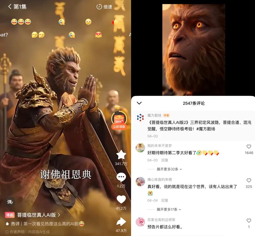 《菩提临世》改编自小说《西游记:菩提祖师下山》,讲述孙悟空含冤而死,六耳猕猴顶替了孙悟空成为斗战圣佛,菩提祖师因此下山踏碎灵山佛国,复活孙悟空后师徒联手报仇的故事。该剧共60集,每集时长约2分钟,画面风格模拟真人,有不少精彩的打斗场面让用户感慨如今AI的强大。目前《菩提临世》第二部的预约人数已超过230万。