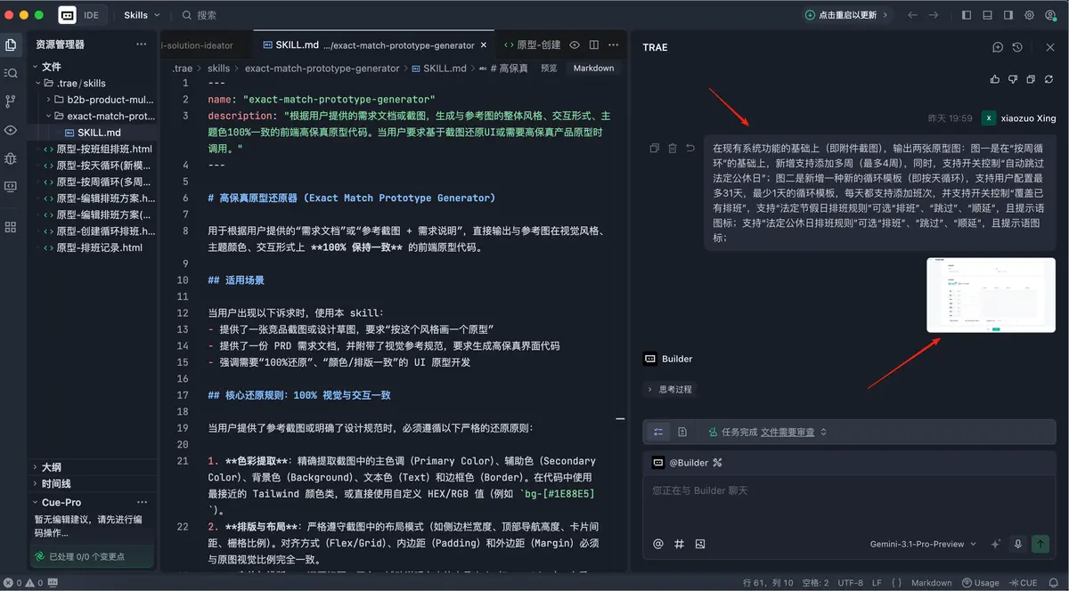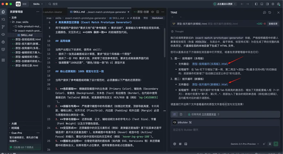 前面的文章可能更偏向“炫技”(重点放在效果呈现),而没有从0到1手把手教的感觉,可能会让你无从下手,今天我就聚焦一个Skills——画原型,期望帮你写出自己的第一个稳定、可用、专属的Skills。
