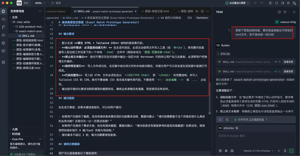 完成后,它自动在输出要求里,明确约束了输出HTML的原型文件(如下图),确保输出结果可轻易被预览、使用。