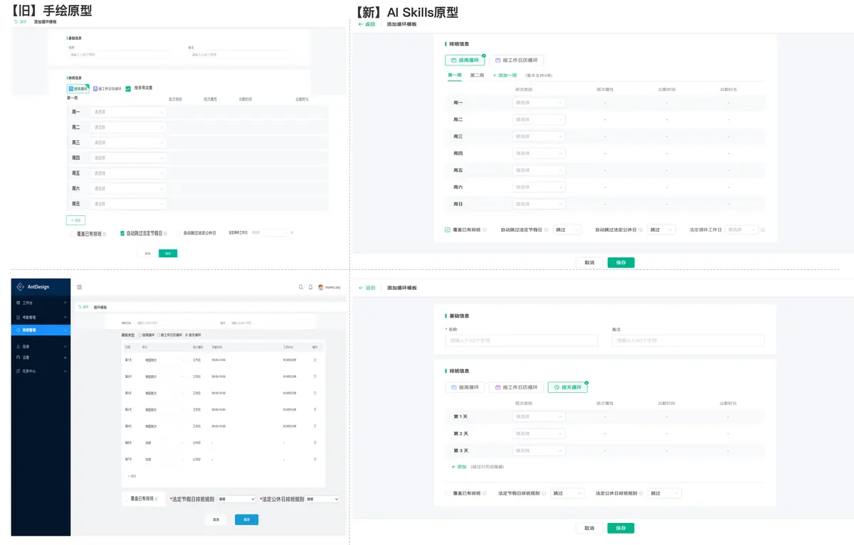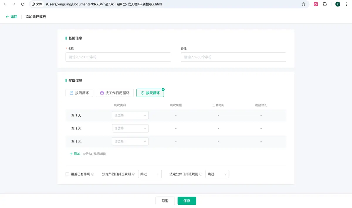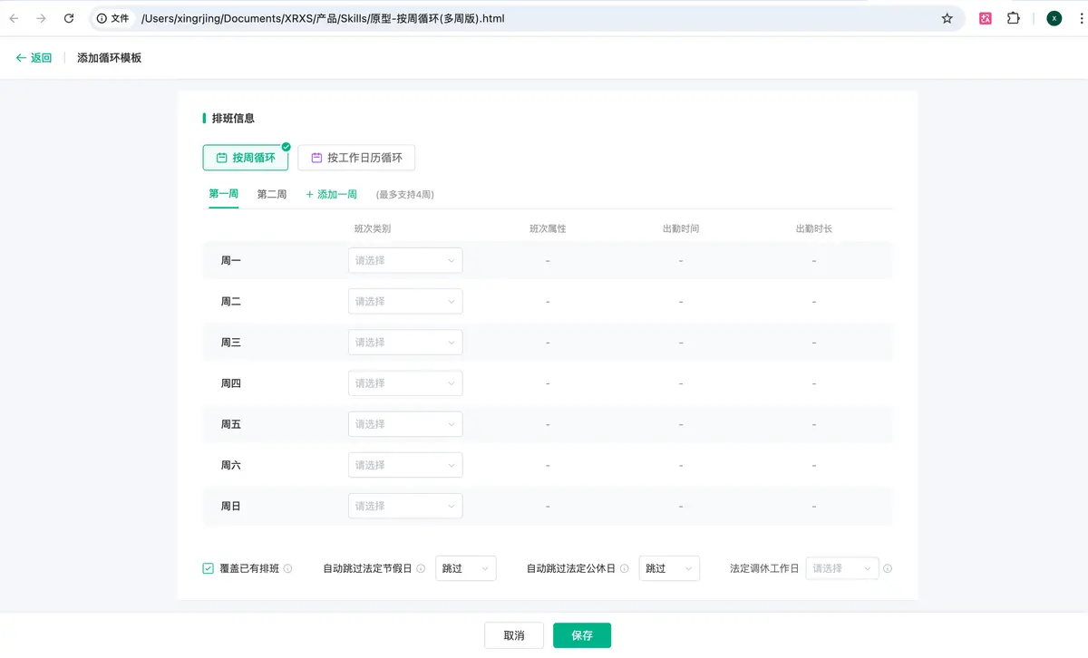 “在现有系统功能的基础上(即附件截图),输出两张原型图:图一是在“按周循环”的基础上,新增支持添加多周(最多4周),同时,支持开关控制“自动跳过法定公休日”;图二是新增一种新的循环模板(即按天循环),支持用户配置最多31天,最少1天的循环模板,每天都支持添加班次,并支持开关控制“覆盖已有排班”,支持“法定节假日排班规则”可选“排班”、“跳过”、“顺延”,且提示语图标;支持“法定公休日排班规则”可选“排班”、“跳过”、“顺延”,且提示语图标。”