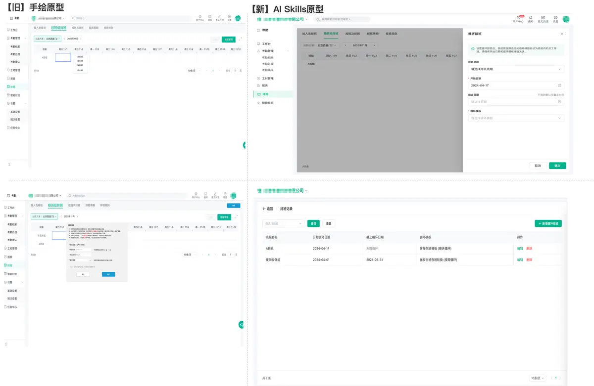“1、“操作按钮”期望不跟“保存”、“班组管理”在一行,而是在它们上一行的右上角(即操作按钮不仅适用于“按组排班”页面);2、“排班记录”页面属于详情页面,你需要记住我们详情页面是没有左边菜单栏,而是全屏页面的设计规划,麻烦调整下。同时,“新建循环排班”跟“循环排班”是同一个功能,不要单独再创建一个详情页面,而是复用“循环排班”的左侧抽屉即可。”