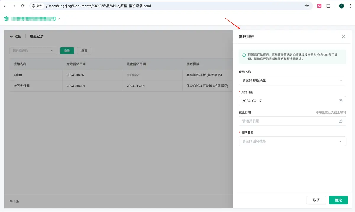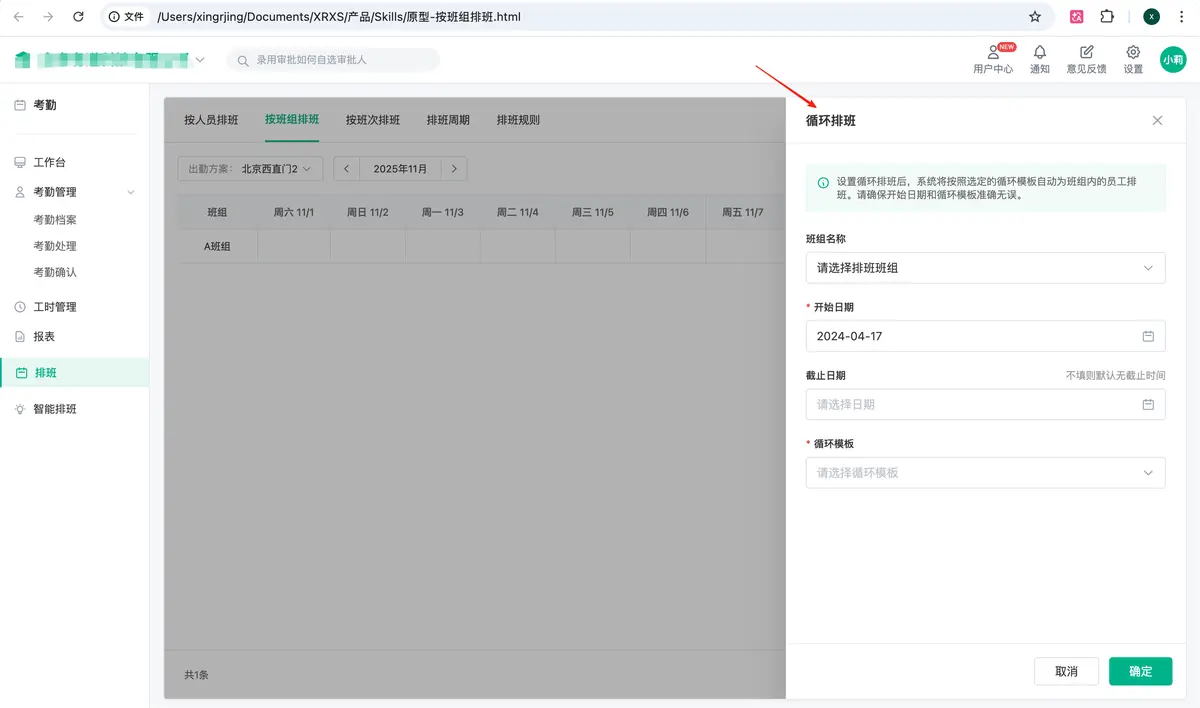 我点击“循环排班”,它自动弹出下面的抽屉页: