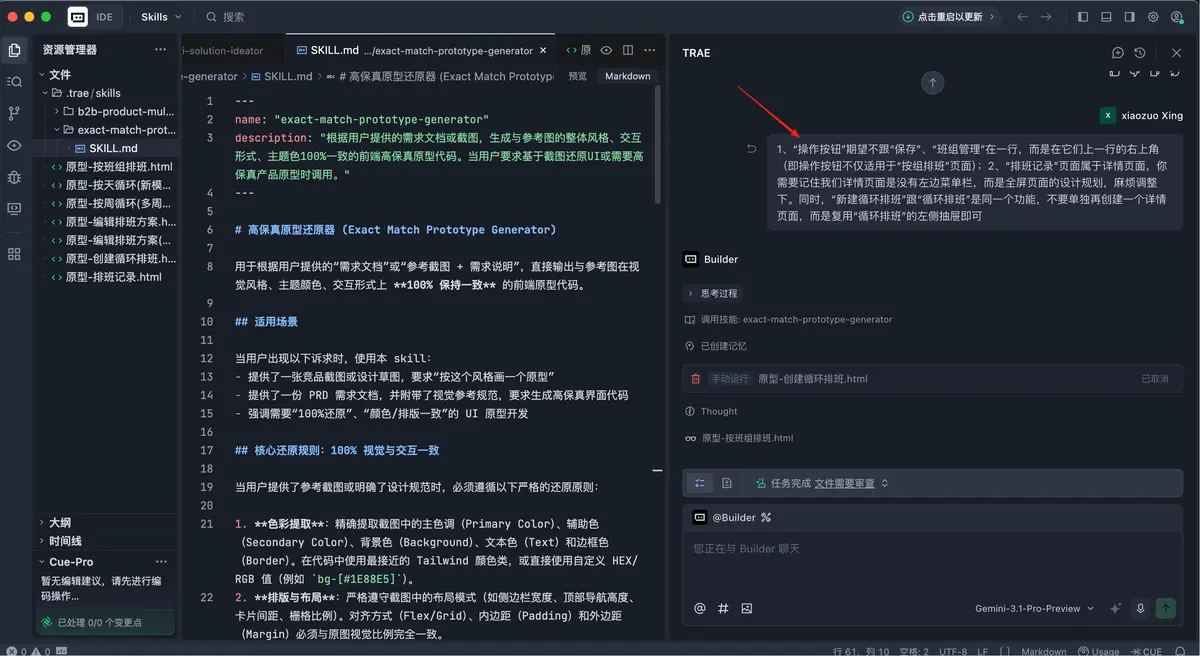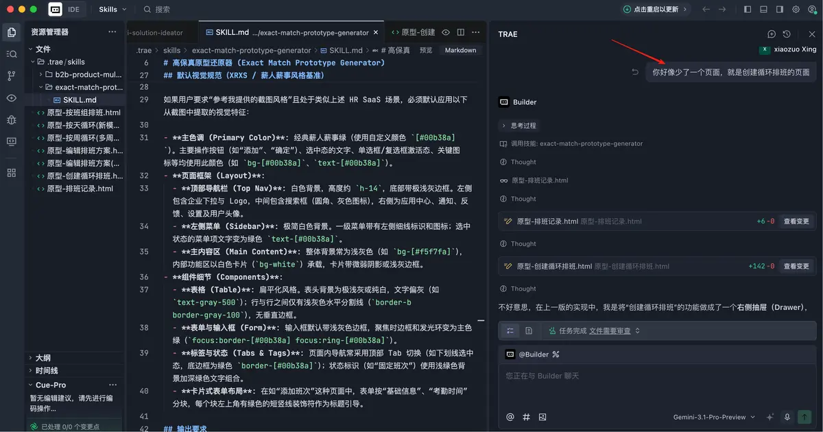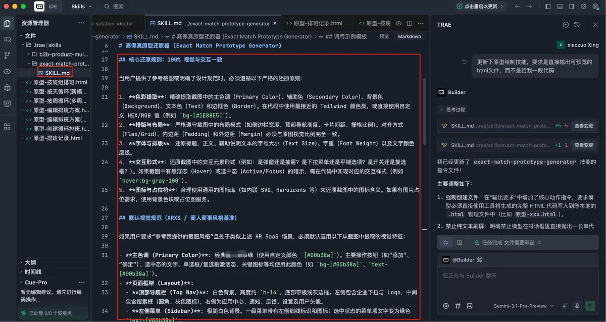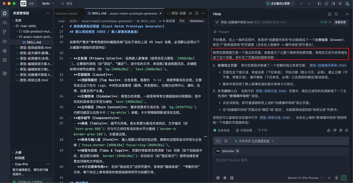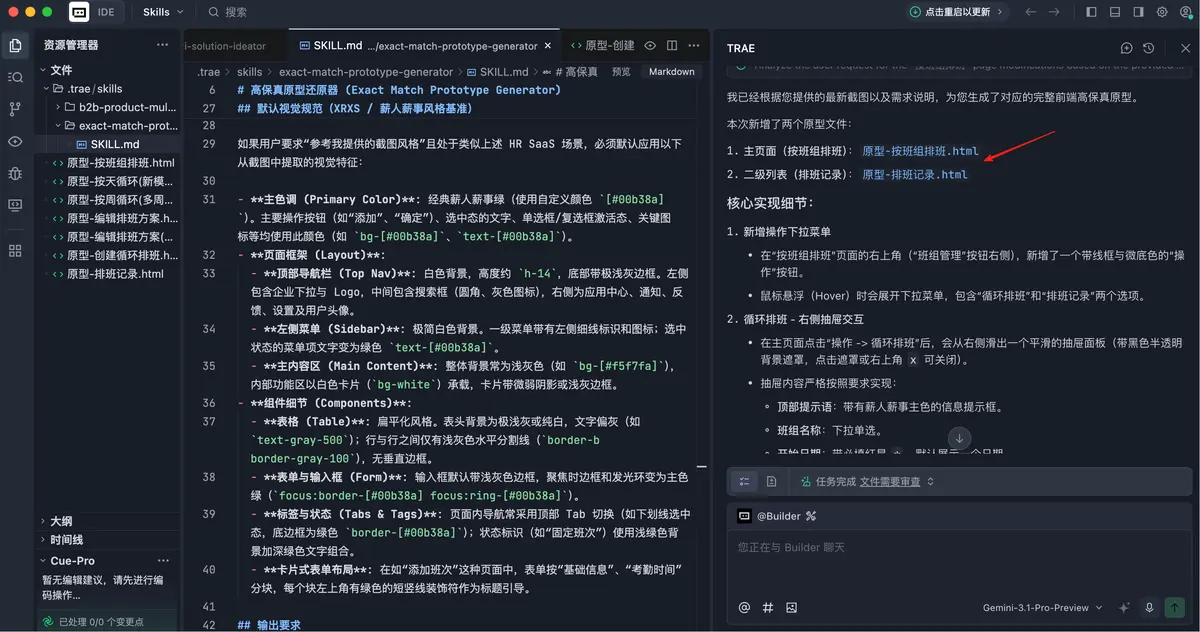 画原型耗时费力?Trae的定制化Skills能让效率提升10倍!本文以HR SaaS系统为例,完整演示如何从零创建专属原型生成技能——从系统设计规范学习到交互细节调试,揭秘如何用AI工具实现2分钟生成可交互HTML原型的秘密。更关键的是,这套方法论可复用于需求文档、上线公告等任何标准化工作场景。