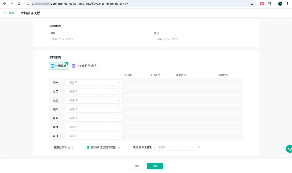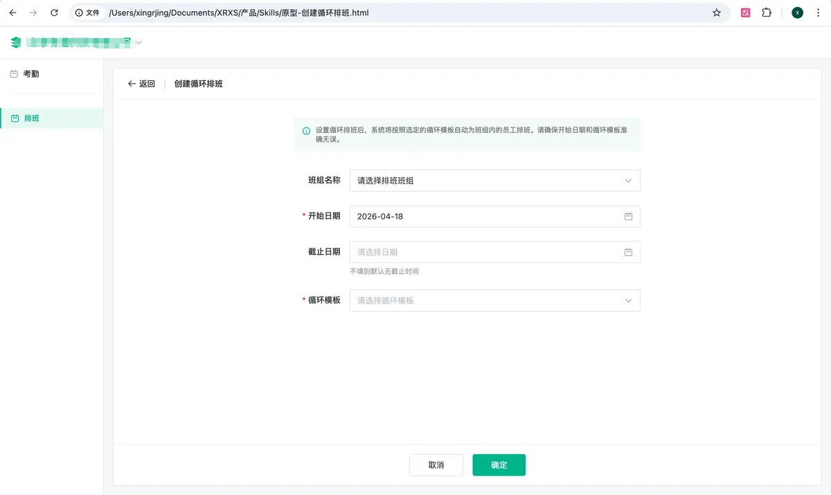在“排班记录”页面,点击“新建循环排班”效果如下: