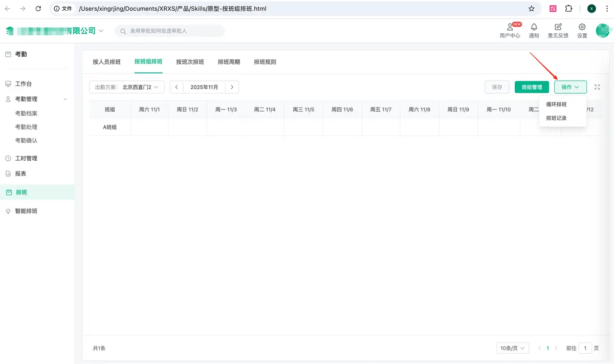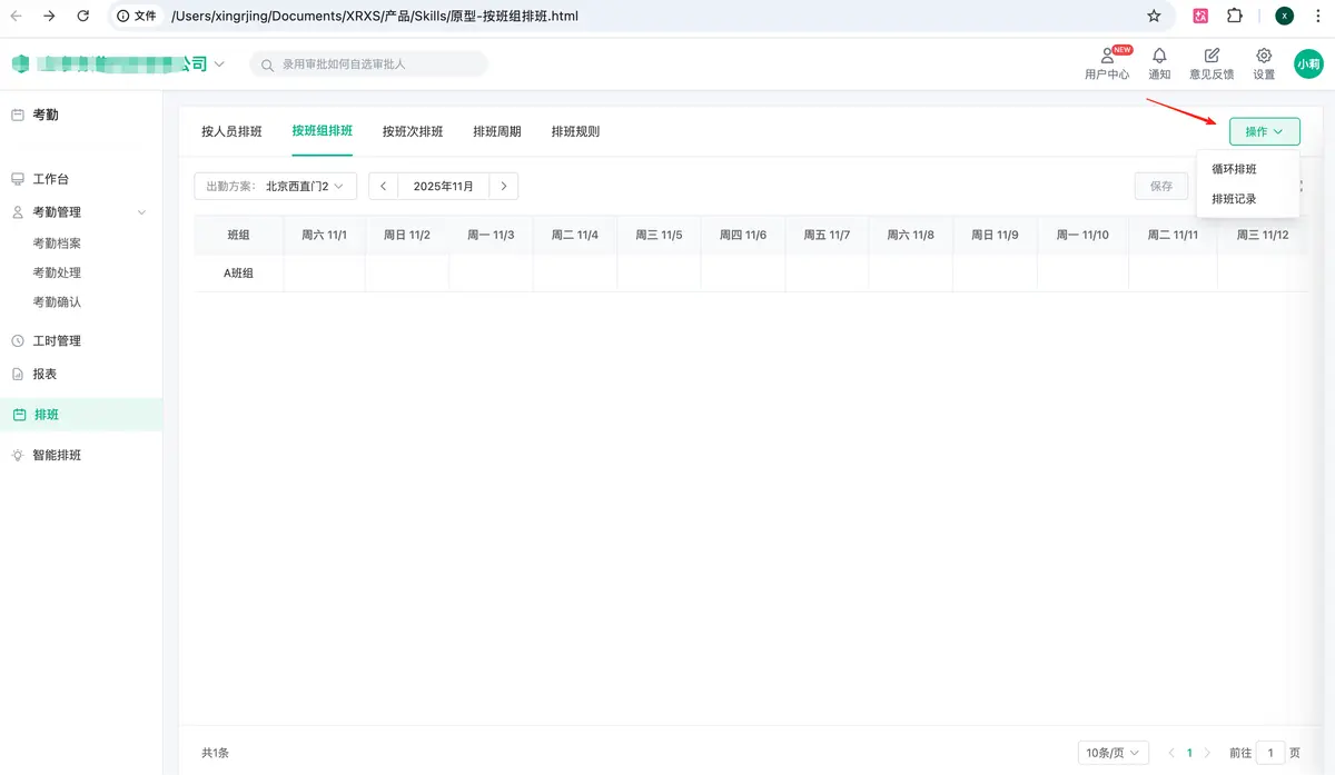 “在现有“按班组排班”的页面右上角,新增一个“操作”下拉框,支持用户选择“循环排班”、“排班记录”,当点击“排班记录”后,进入一个二级列表页面,列表元素包含:班组名称、开始循环日期、截止循环日期(可不设置,不设置代表无限循环)、循环模板(即关联了哪个循环模板)、操作(编辑、删除);点击“循环排班”,则弹窗或右侧边抽屉的方式,让用户添加对应循环排班,最上面是一段提示语,下面的元素包含:班组名称(下拉单选,支持用户选择排班班组名称)、开始日期(日期控件,默认是今天,必填)、截止日期(可不填,不填默认就是无截止时间,需要提示语)、循环模板(下拉单选,必填),确定、取消”