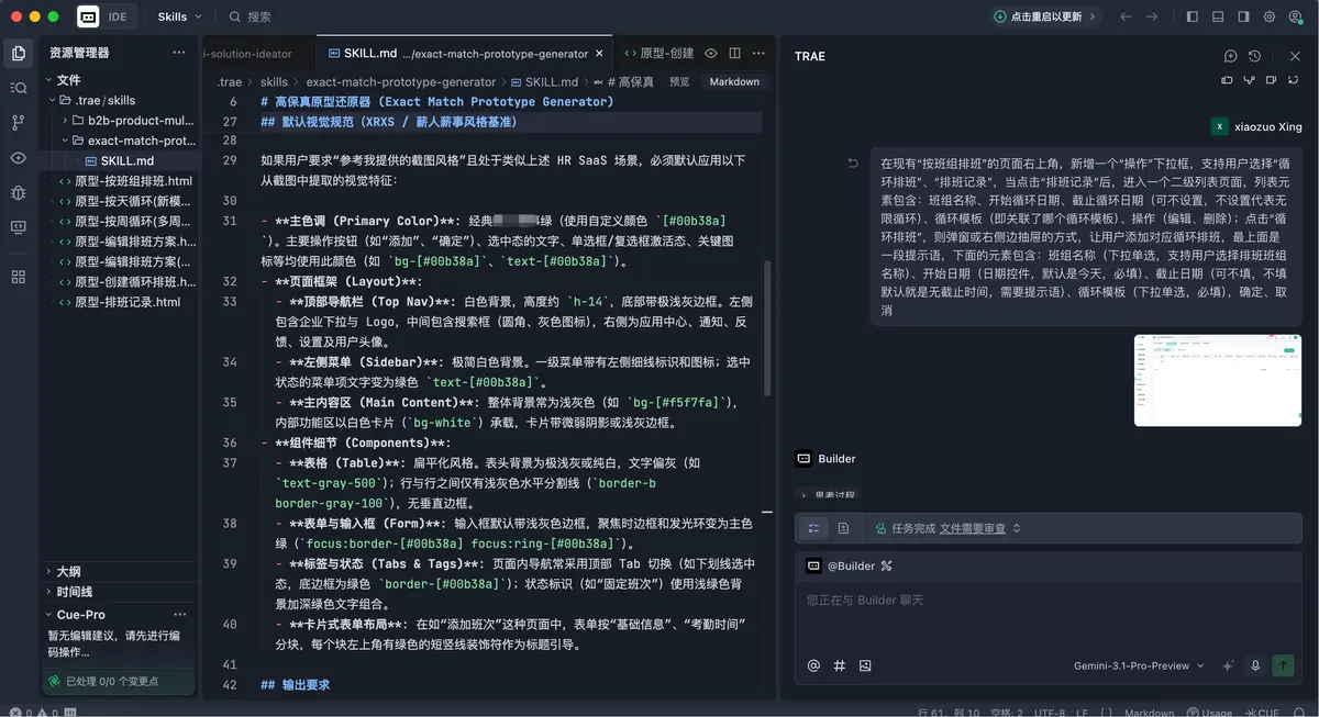 你可以注意看下Skills文件里(如下图),它实际把原系统的视觉规范、主题颜色、交互形式,都已写到技能里,相当于完成了“预训练”,确保后续输出原型时,基本符合你们系统规范。