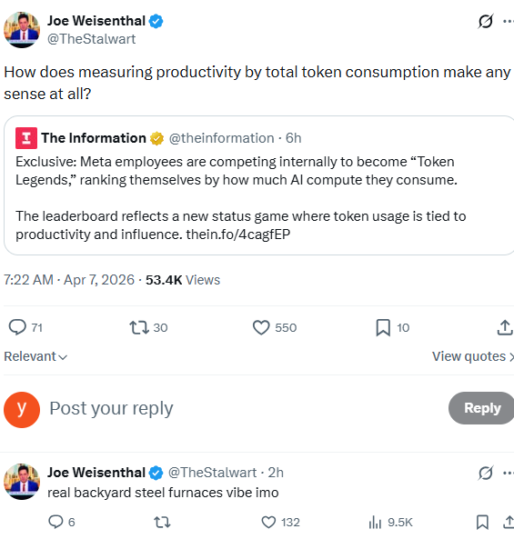 Meta内部已经有团队将Token消耗量作为AI渗透率的衡量标尺,部分员工为了“显得自己很懂AI”,会故意运行大量冗余的模型调用任务;国内腾讯等大厂也被爆料存在类似现象,一些业务线甚至发明了“Token刷量”的灰色操作。