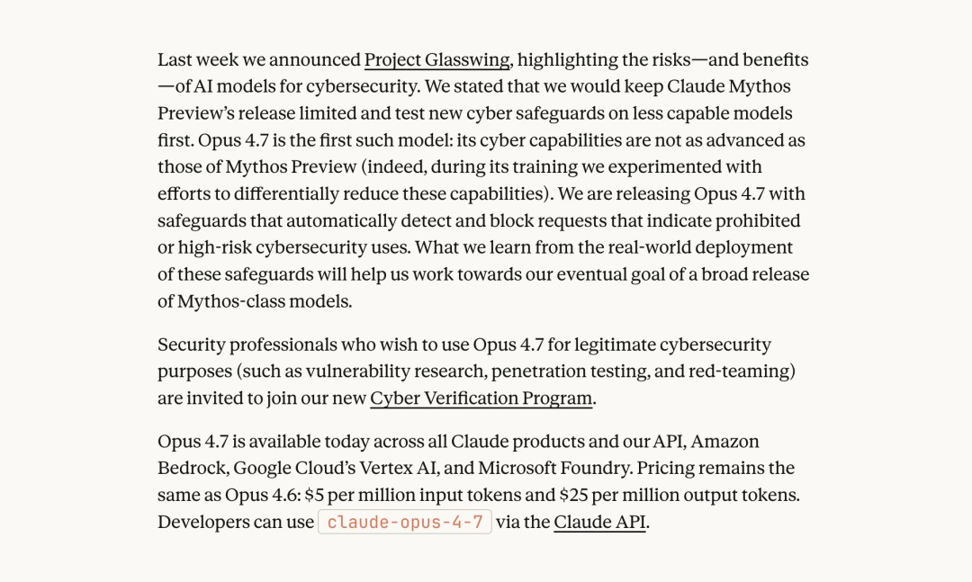但由于 Mythos Preview 实在过于强大,Anthropic 认为贸然发布“将对经济、公共安全和国家安全造成严重后果”,他们决定只暂时只开放给少数合作伙伴测试。最新发布的 Opus 4.7,则是他们有意降低了网络安全能力的版本。