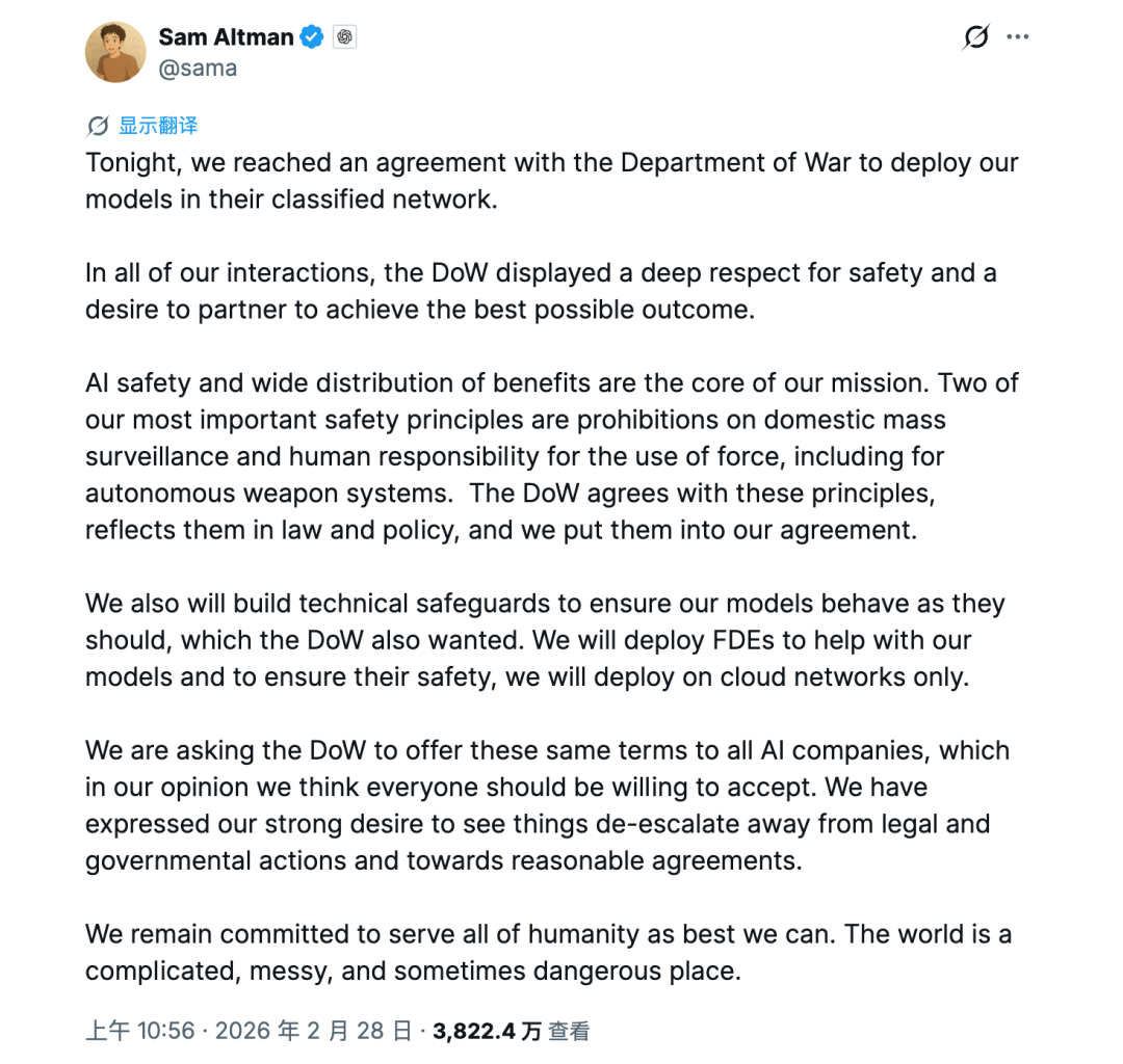 按理说,面对特朗普政府的铁拳,本该是美国 AI 同仁们联合起来、与万恶的资本主义政府斗争的时刻。但就在 Anthropic 谈判破裂的几小时后,Sam Altman 就对外官宣 OpenAI 已与美国国防部达成合作。OpenAI 在新闻稿中还专门强调,和 Anthropic 此前的合作协议相比,他们的方案拥有更多的安全防护措施。