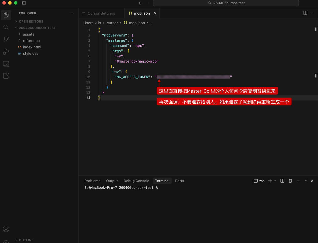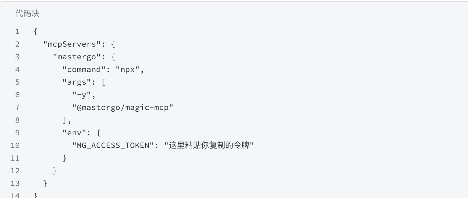 1、把 “这里粘贴你复制的令牌” 换成刚才在 MasterGo 里生成的长字符串。 记得保留前后的双引号。