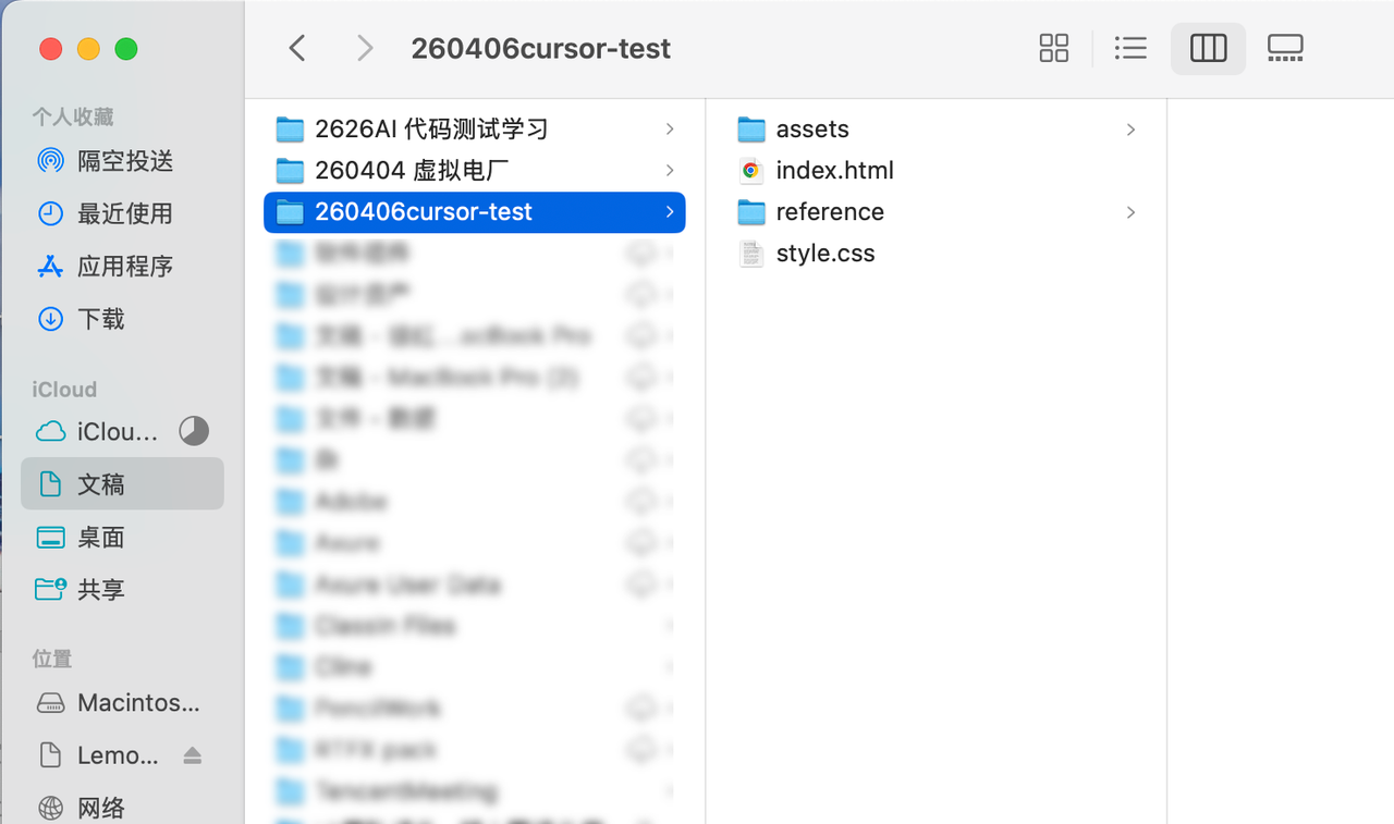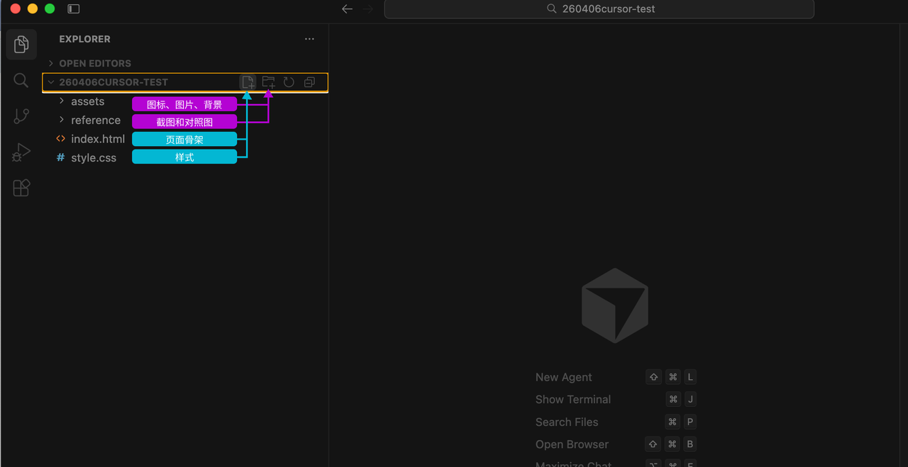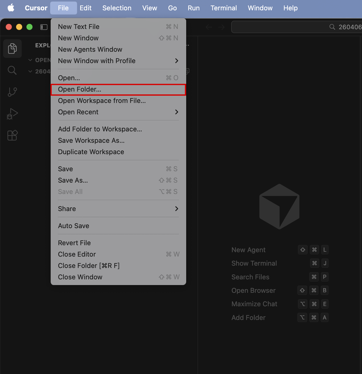 打开 Cursor,点击顶部菜单栏的 File -> Open Folder…。 然后选中我们刚才创建的项目文件夹(比如我们刚才起名 20260406cursor-test)。