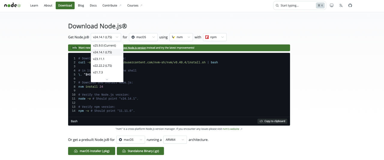 直接去 Node.js 官网下载就行。 如果你不知道选哪个版本,优先选 LTS(长期支持版)。我下载的 v24.14.1版本 目前没啥问题