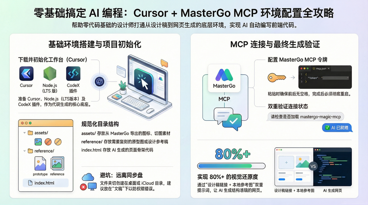 AI 写代码对零基础用户来说,最难的往往是环境配置。本文手把手教你如何用 Cursor、MasterGo MCP、Node.js 和 CodeX 搭建 AI 前端开发环境,从下载工具到连接设计稿,每一步都配有避坑指南。跟着教程走,即使没有代码基础,也能轻松让 AI 按设计稿生成可运行的 B 端页面。