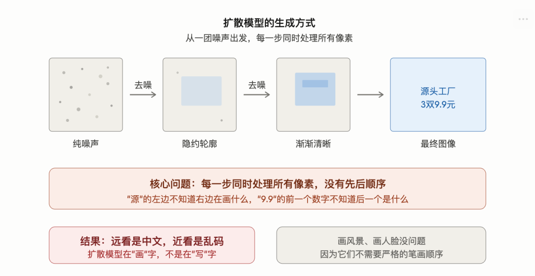扩散模型的问题不是画得不够好,是它的生成方式和文字的本质需求之间存在根本矛盾。文字需要笔画顺序和空间结构,扩散模型没有顺序的概念。