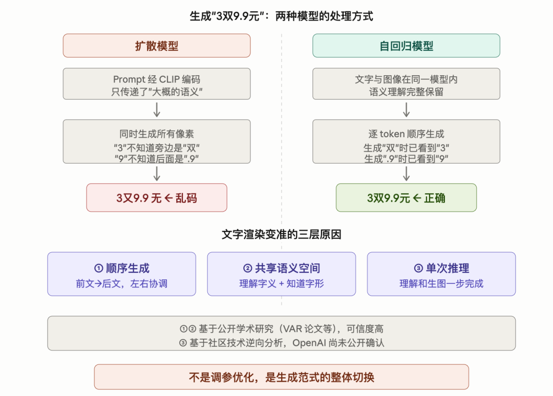 这和扩散模型形成了根本对比。扩散模型同时生成所有像素,3和双和9.9和元互相不知道对方在画什么。自回归模型有先后顺序,先画的部分会影响后画的部分,天然保持了一致性。