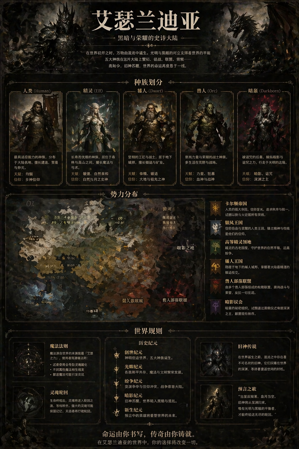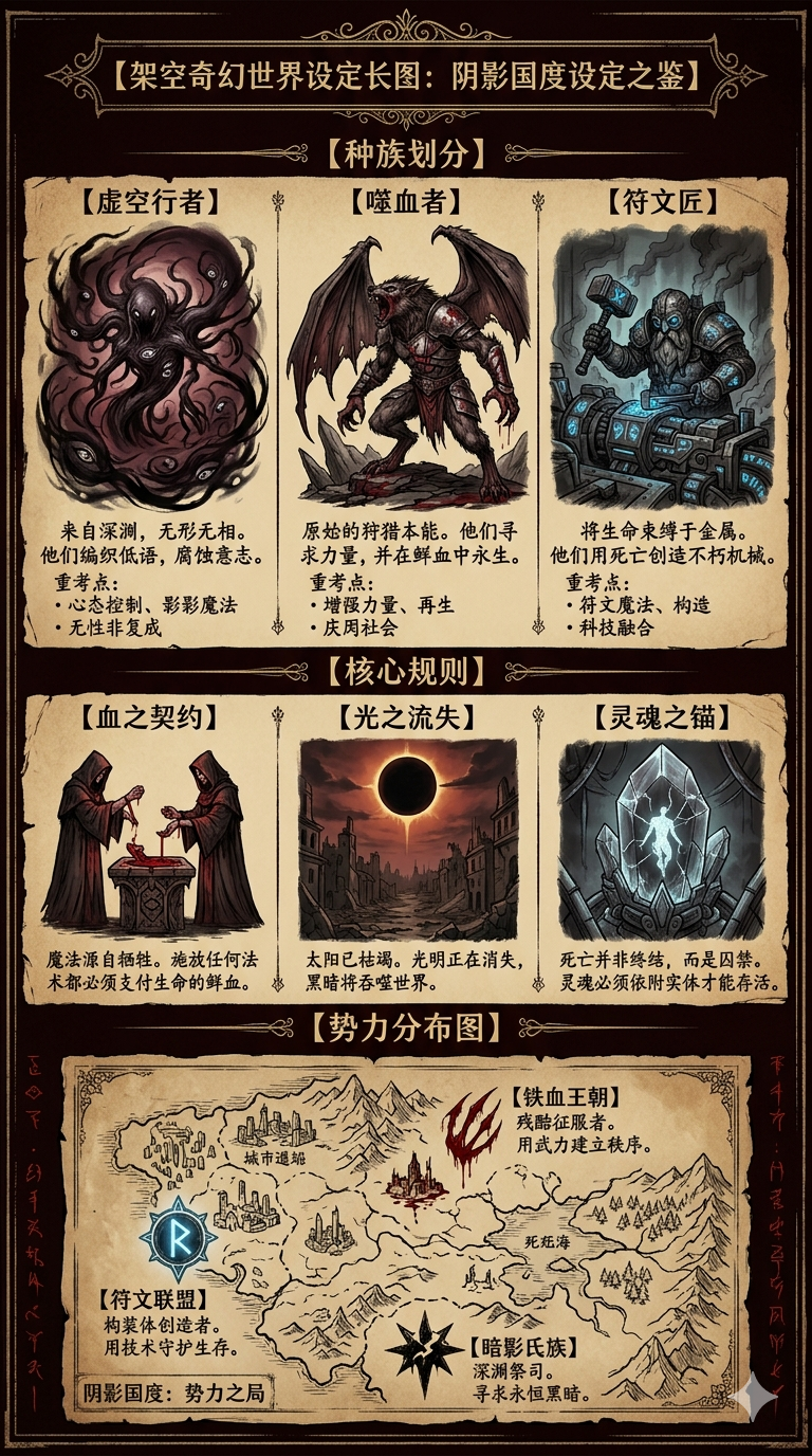 架空奇幻世界设定长图,种族划分、规则介绍、势力分布,手绘插画 + 文字注解,暗黑幻想风。