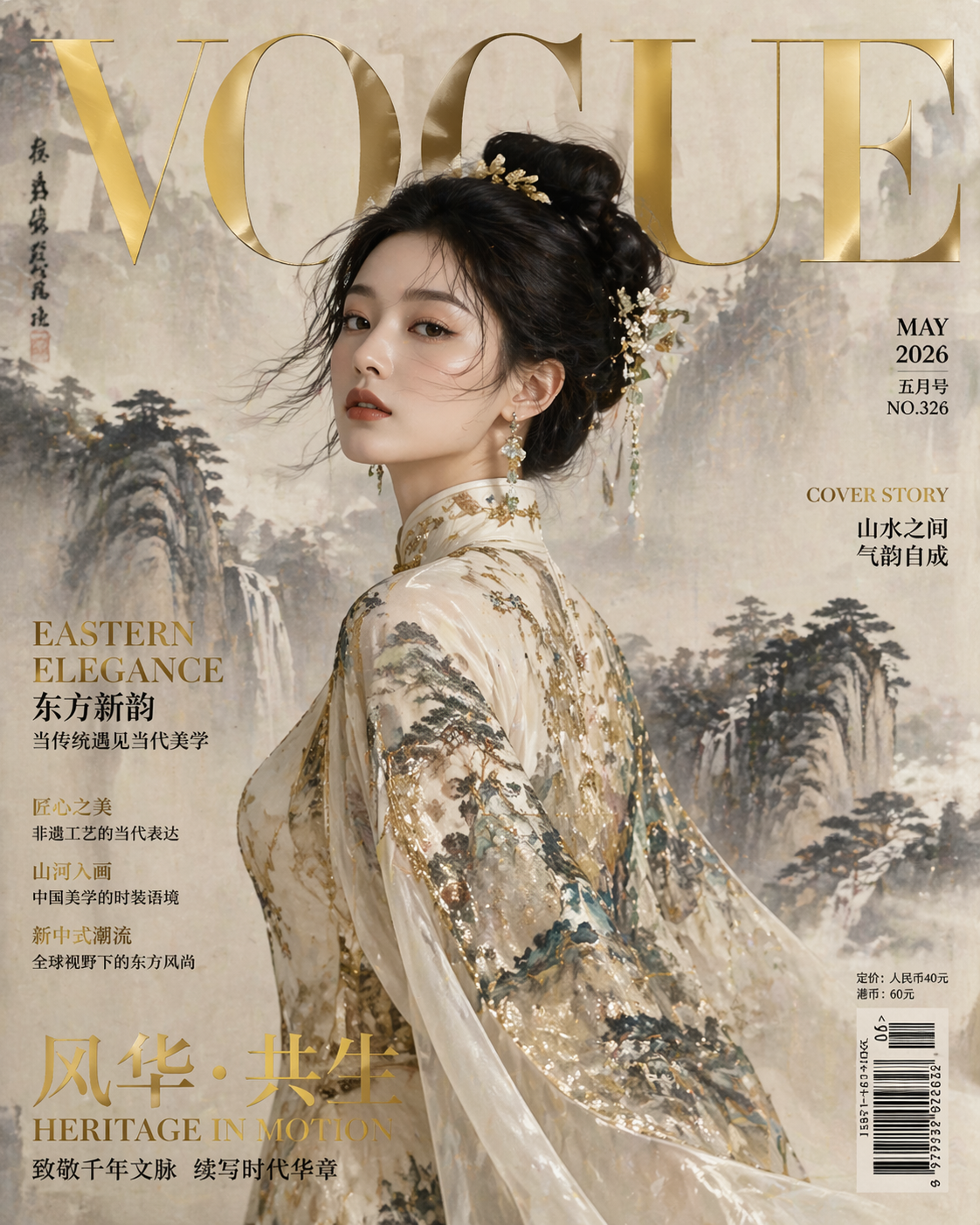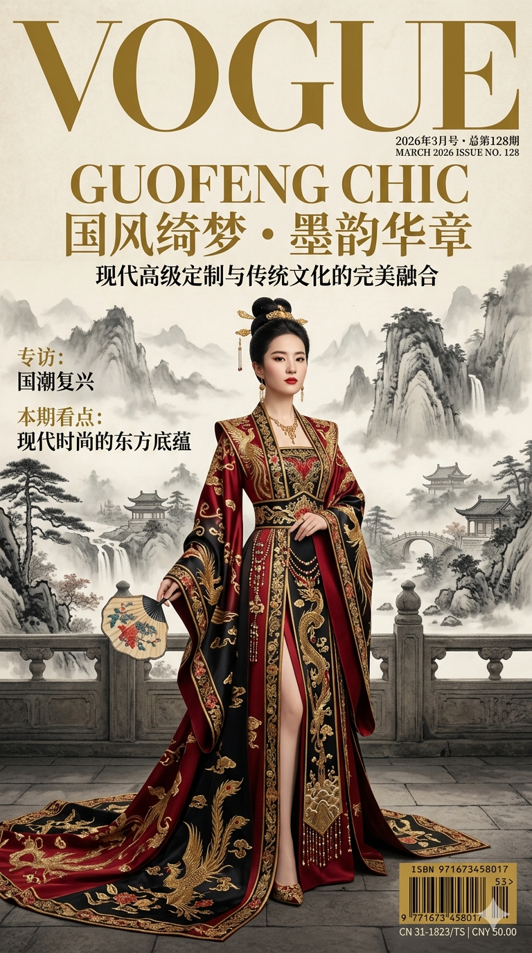 画一张《VOGUE》风格时尚封面,主角穿国风礼服,背景水墨山水,经典刊名字体,烫金标题,右侧期号与条形码齐全。