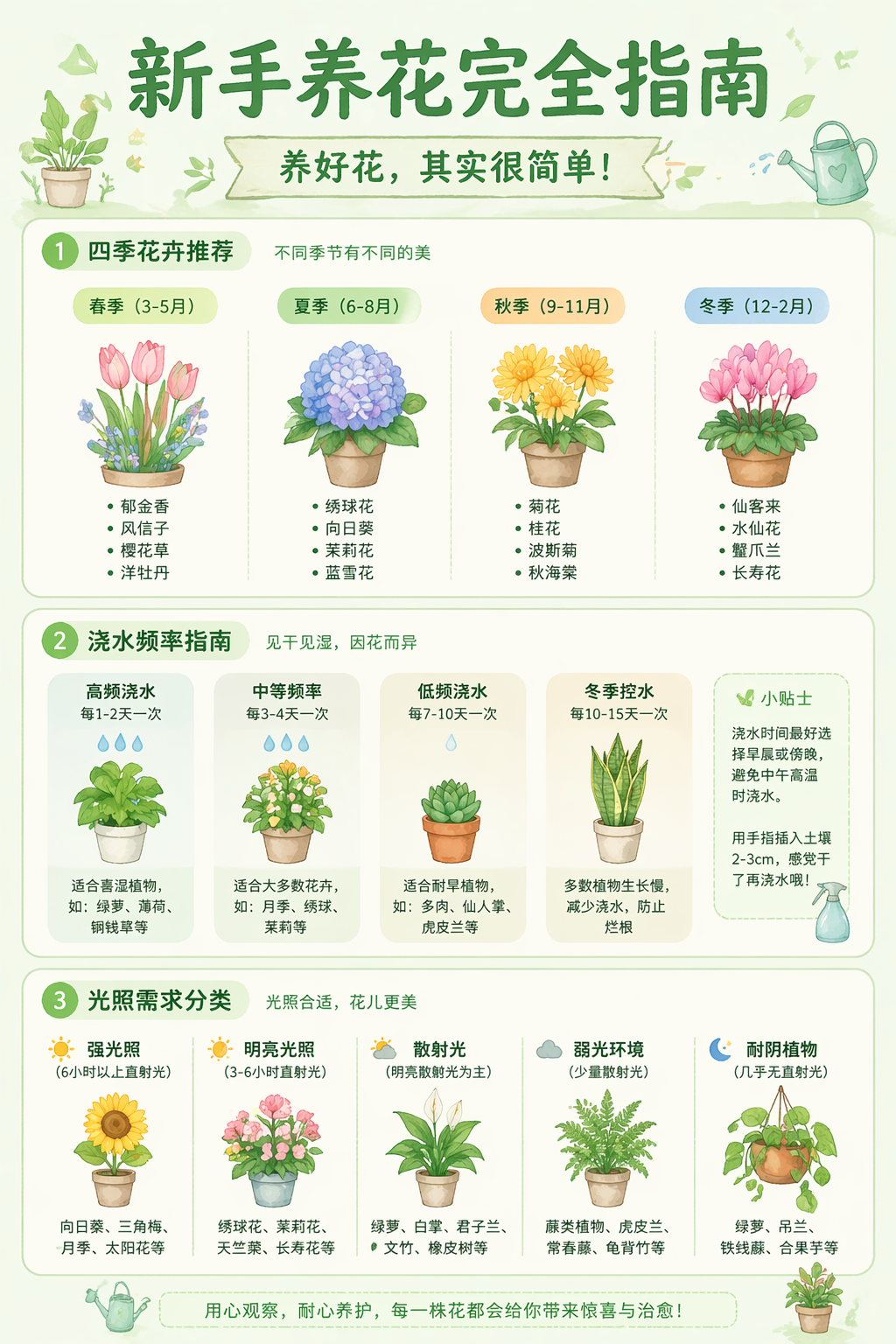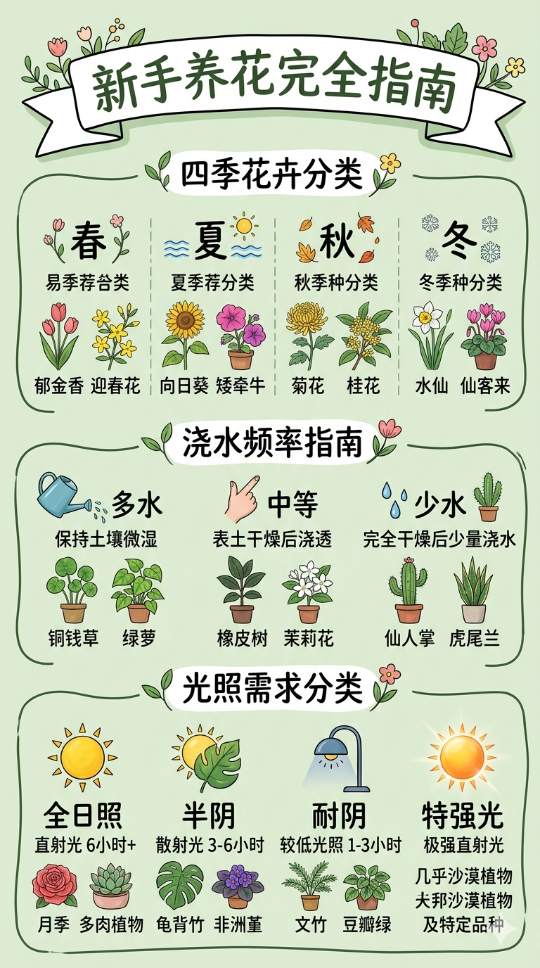 画一张竖版「新手养花完全指南」信息图,按四季花卉、浇水频率、光照需求分类,配手绘花卉插画,淡绿底色小清新风格。