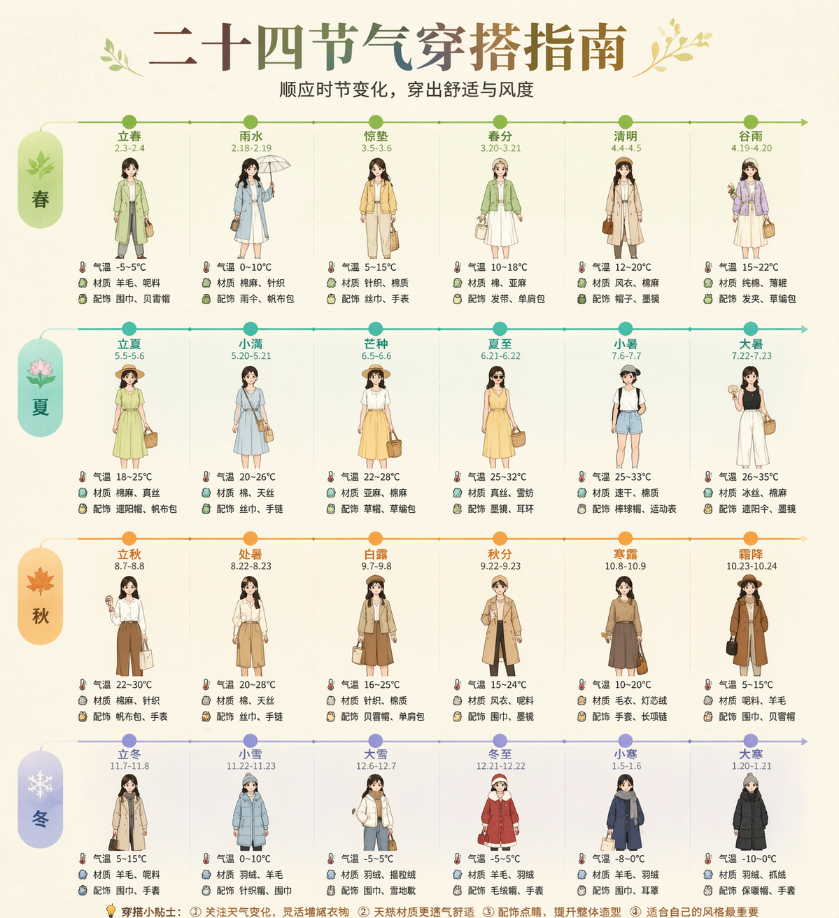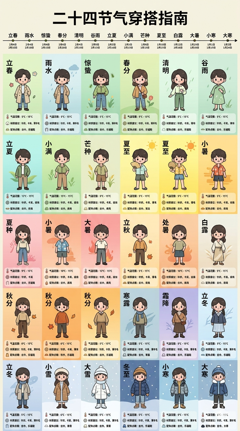 画一张「二十四节气穿搭指南」长图,横向时间轴贯穿整图,每个节气一个小人偶展示当日穿搭,标注气温范围、材质建议、配饰点睛。浅米色底配二十四种渐变色。