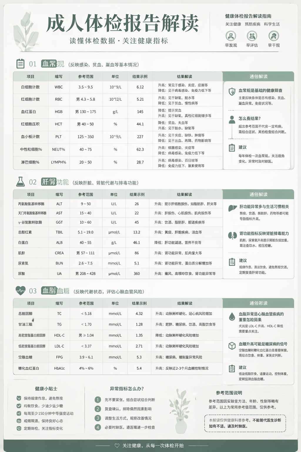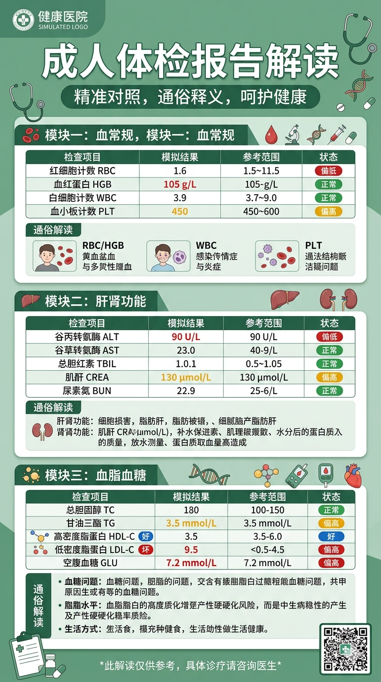 画一张「成人体检报告解读」长图,分血常规、肝肾功能、血脂血糖模块,数据对照表 + 通俗解读,莫兰迪绿,医院报告版式。