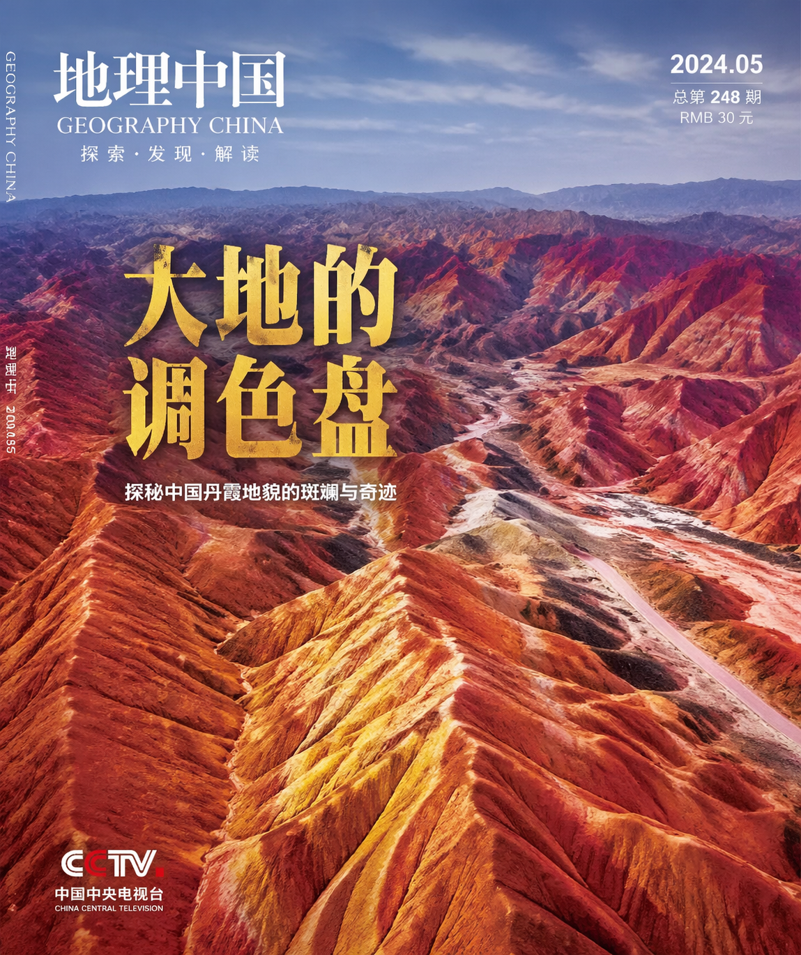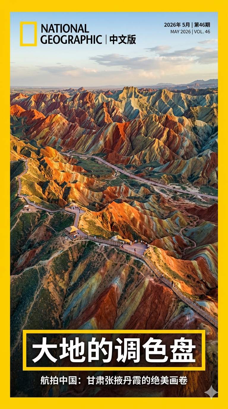 画一张《地理中国》封面,航拍中国丹霞地貌,大字标题「大地的调色盘」,左下角 logo,写实摄影质感。