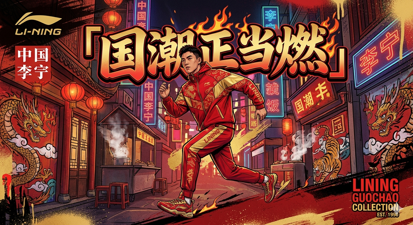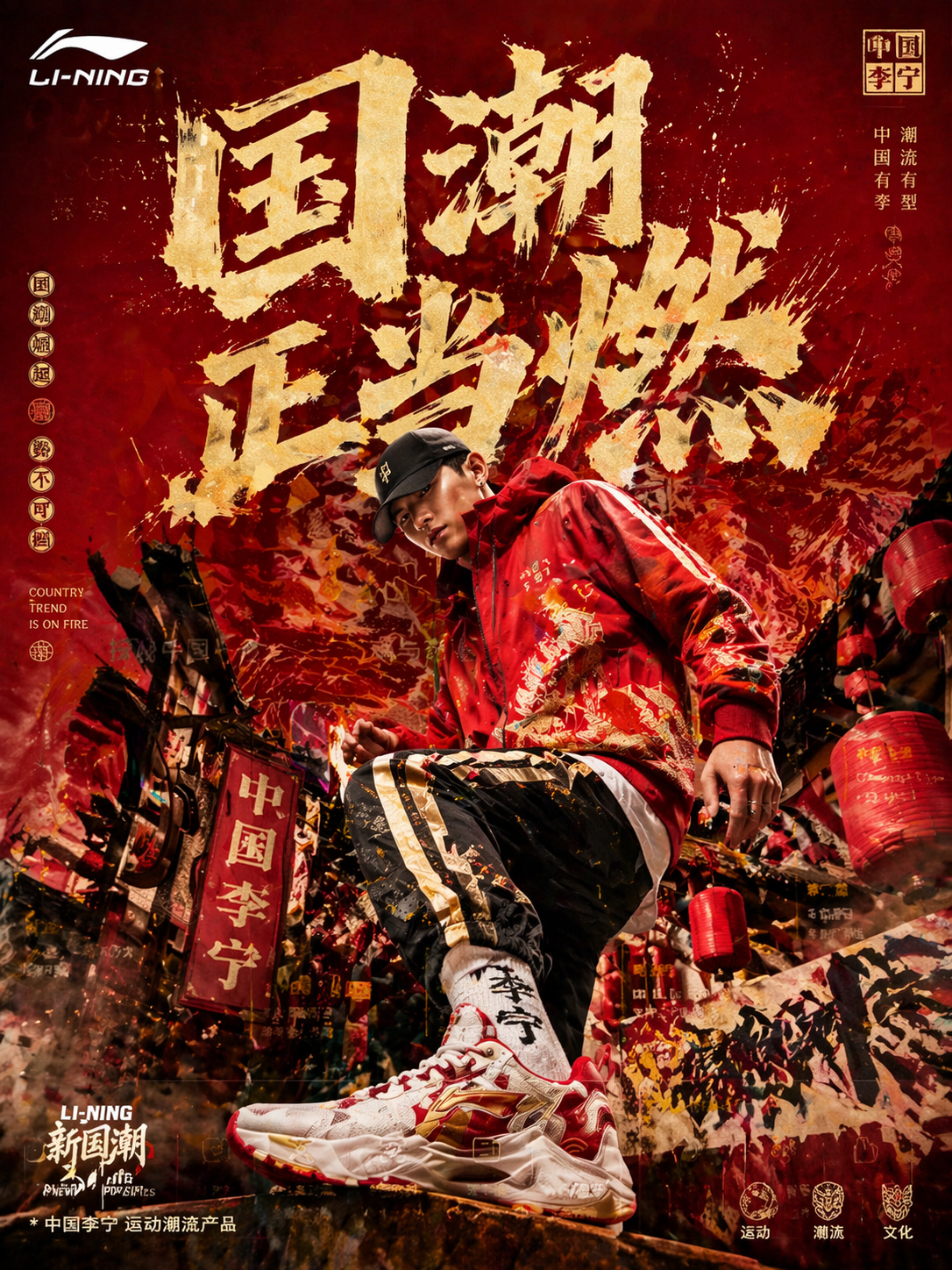 画一张李宁国潮海报,红金配色,主角穿国风运动服,大字「国潮正当燃」,街头潮流风格。