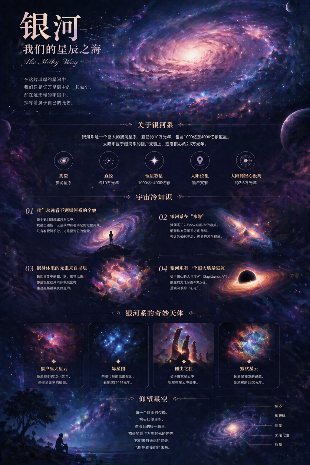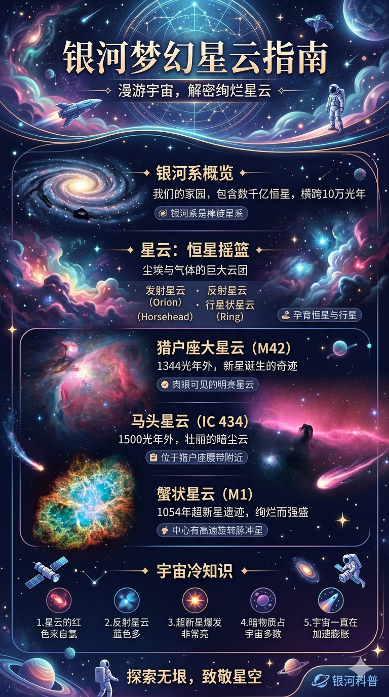 银河星云科普长图,梦幻星云插画、宇宙冷知识,浪漫科幻感。