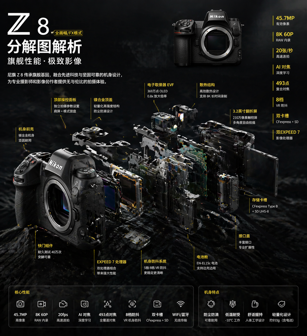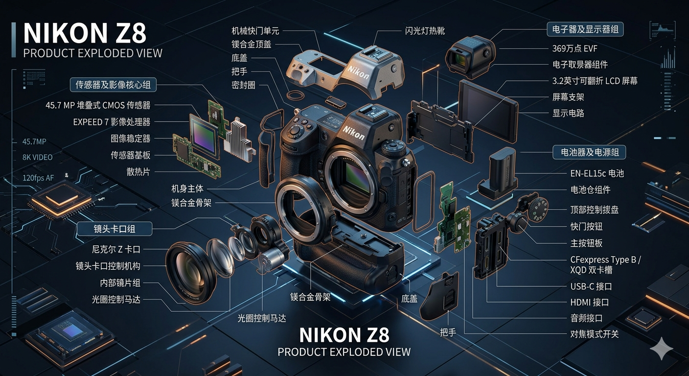 给尼康Z8相机设计一张酷炫详细的产品分解图