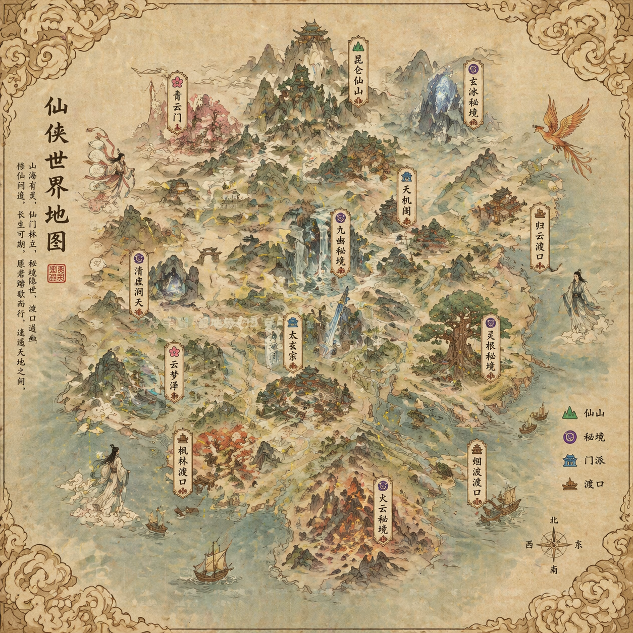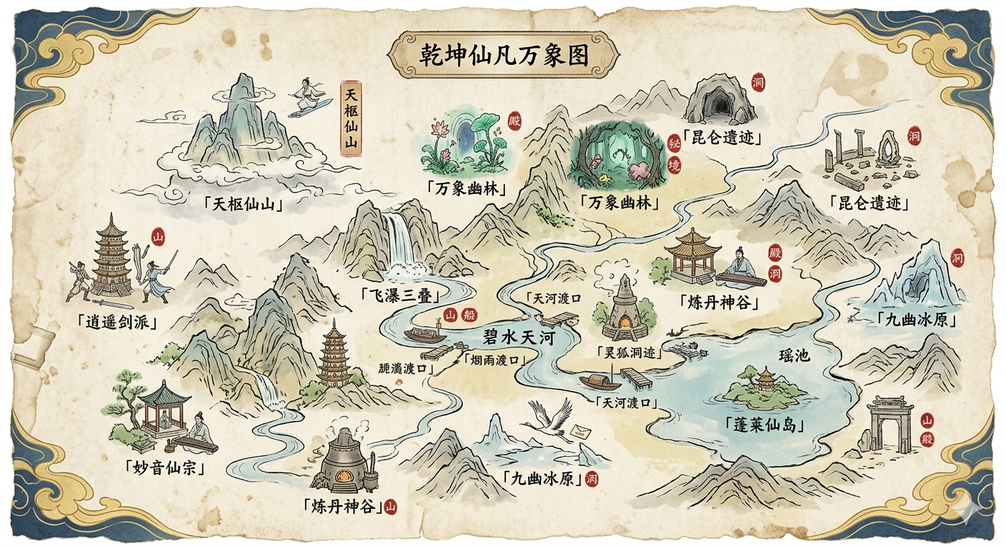 画一张仙侠世界手绘地图,宣纸质感,标注仙山、秘境、门派、渡口,配古风小插画,四角祥云纹样。