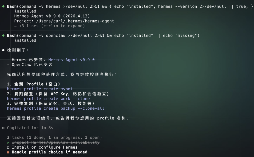 如果我的本地已经安装了Hermes,以对话的形式向我确认是要新建一个空白的profile还是保留配置,还是完整复刻。