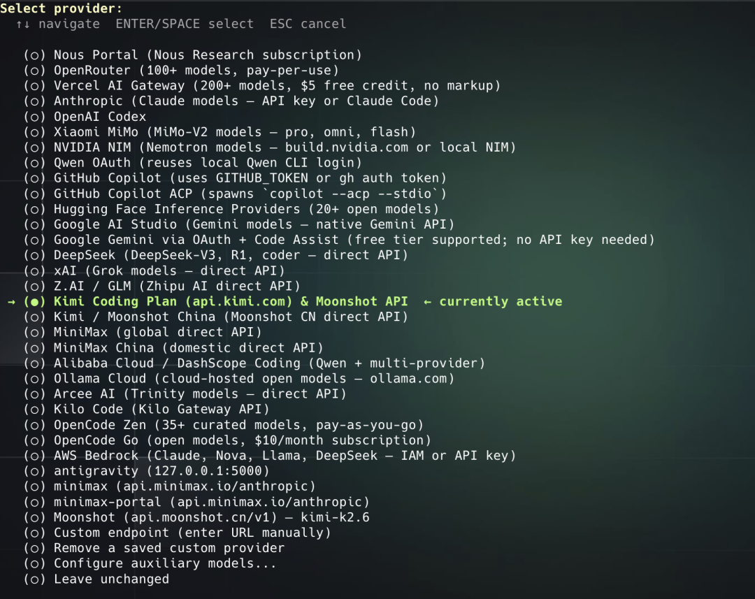 安装的过程基本都是跟着Agent出的选项点yes就好了,到了模型这一步到话选Kimi Coding Plan里面的Kimi K2.6。
