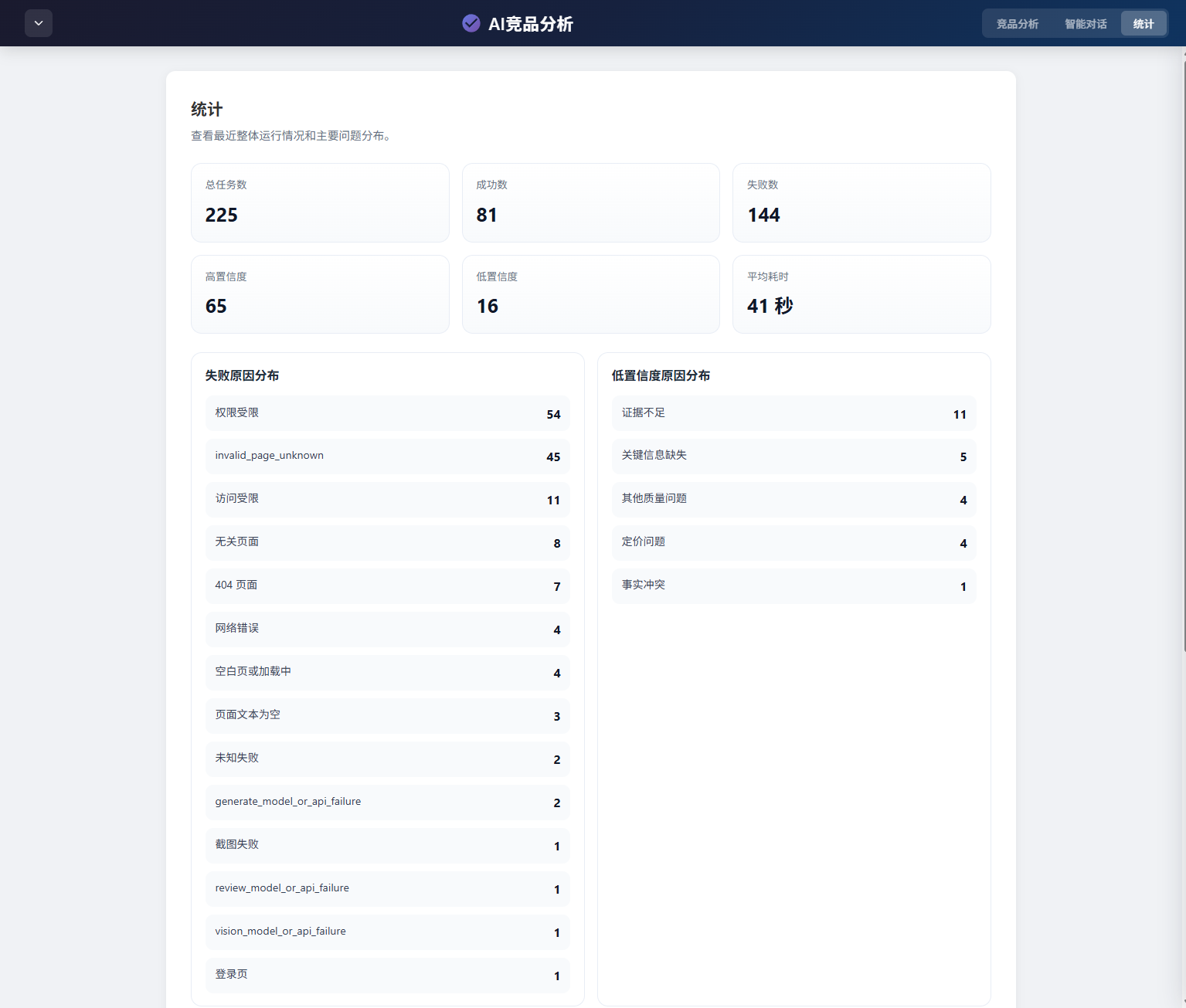 - 死因分类:是遇到不该分析的无效页?还是采集失败?或者大模型接口抽风?