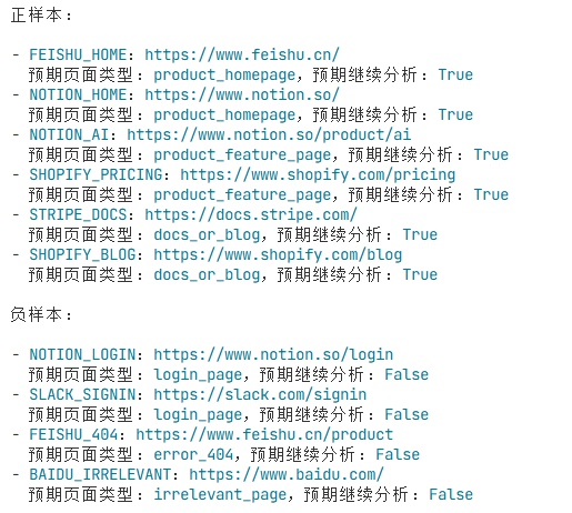 - 正样本: 产品首页、功能页、定价页等。期望结果:顺利生成高置信度报告。