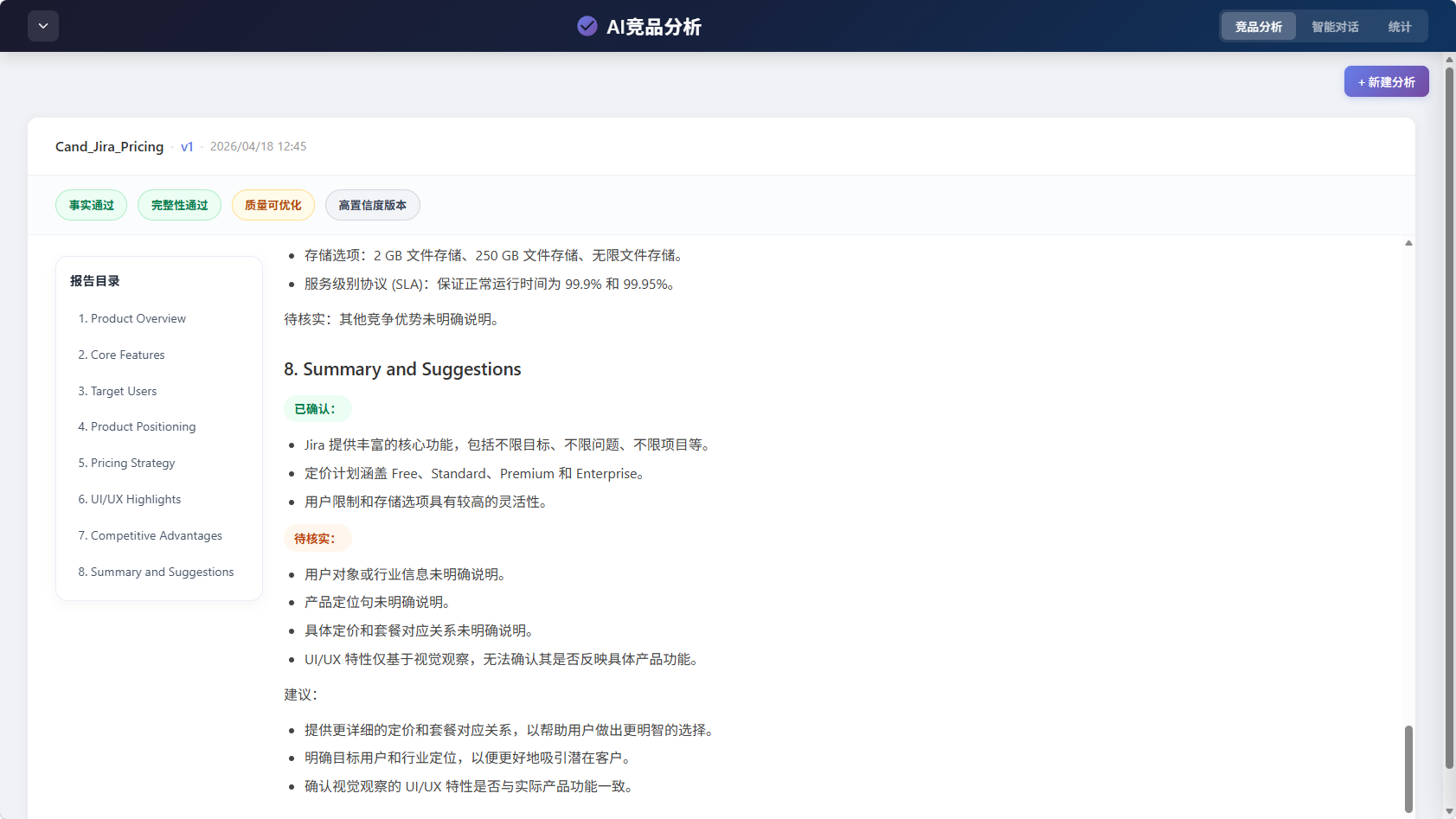- 生搬硬套:竞品分析模板有点像“八股文”,有些明明没有的信息,AI 为了凑字数和结构,强行捏造出来,这又是个典型的幻觉。