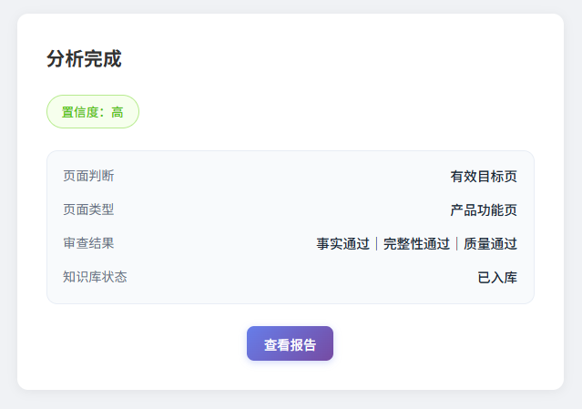2. 完成页改造: 以前只扔给用户一个干巴巴的“高/低置信度”。现在,我把后端的页面判断、页面类型、审查结果、知识库状态,全翻译成大白话亮在台面上,让用户一眼看懂这次分析的成色。