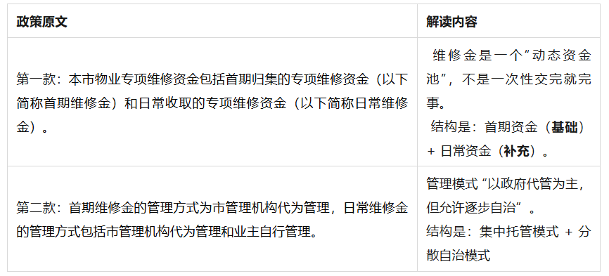 举个例子,某市维修金政策的第三条原文为“一个物业管理区域内有两个以上独立产权单位和房屋所有权人的,应当设立物业专项维修资金。一个物业管理区域内仅有一个独立产权单位的,可以自愿选择设立物业专项维修金。”