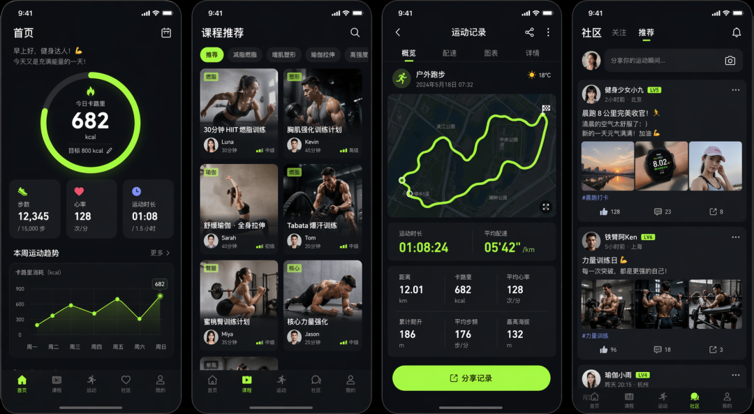 第四个是社区动态页,展示用户运动打卡的图文动态流。深色主题配荧光绿点缀,所有文字使用中文