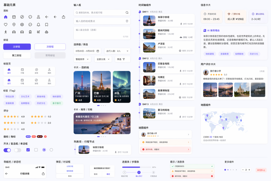 按钮、卡片、图标、导航栏、标签……整齐平铺出来,稍微调整下,这个 App 的 UI 设计规范就能用了。