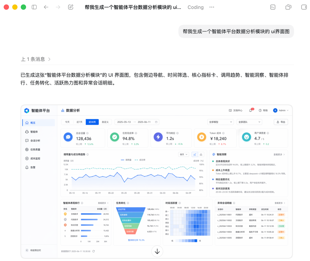 以前我用飞书从零开始画,至少半天。现在呢?一句话,直接让它生成一个智能体平台的产品架构。