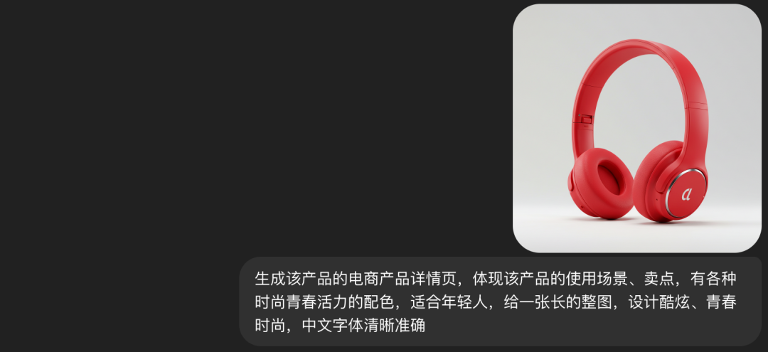 于是,我上传了一张耳机的商品图(连这个耳机也是 AI 生成的),然后一句话让它出一张电商详情页:
