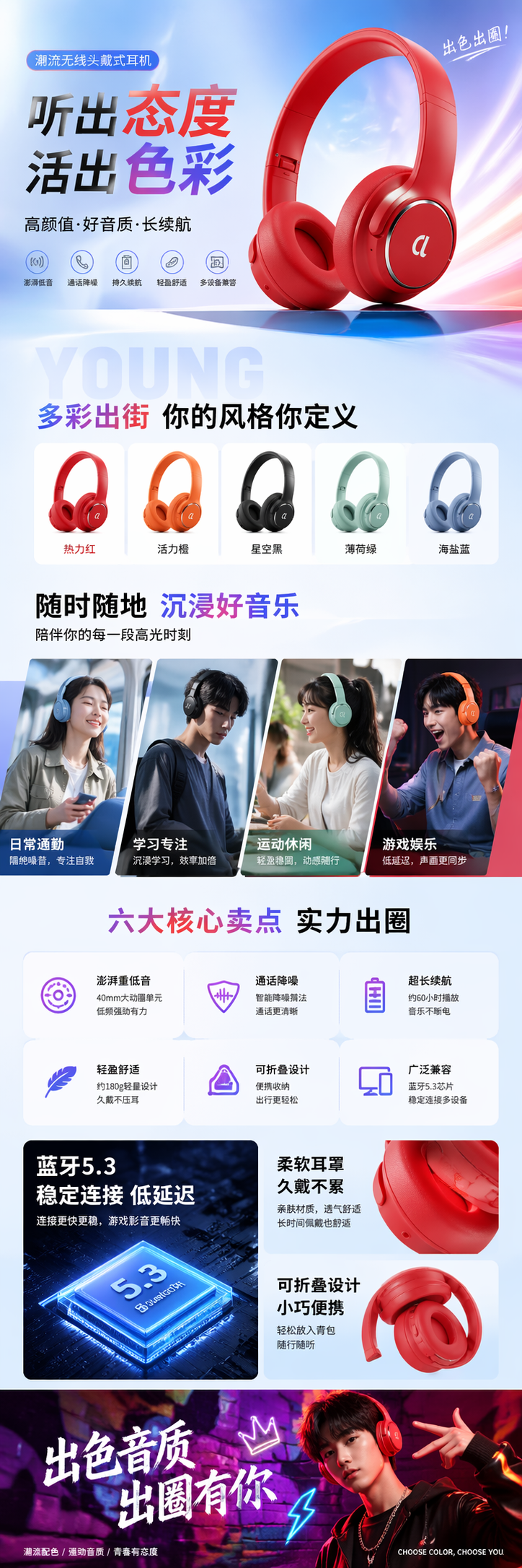产品卖点、使用场景、参数信息、排版配色,一次就全出来了。