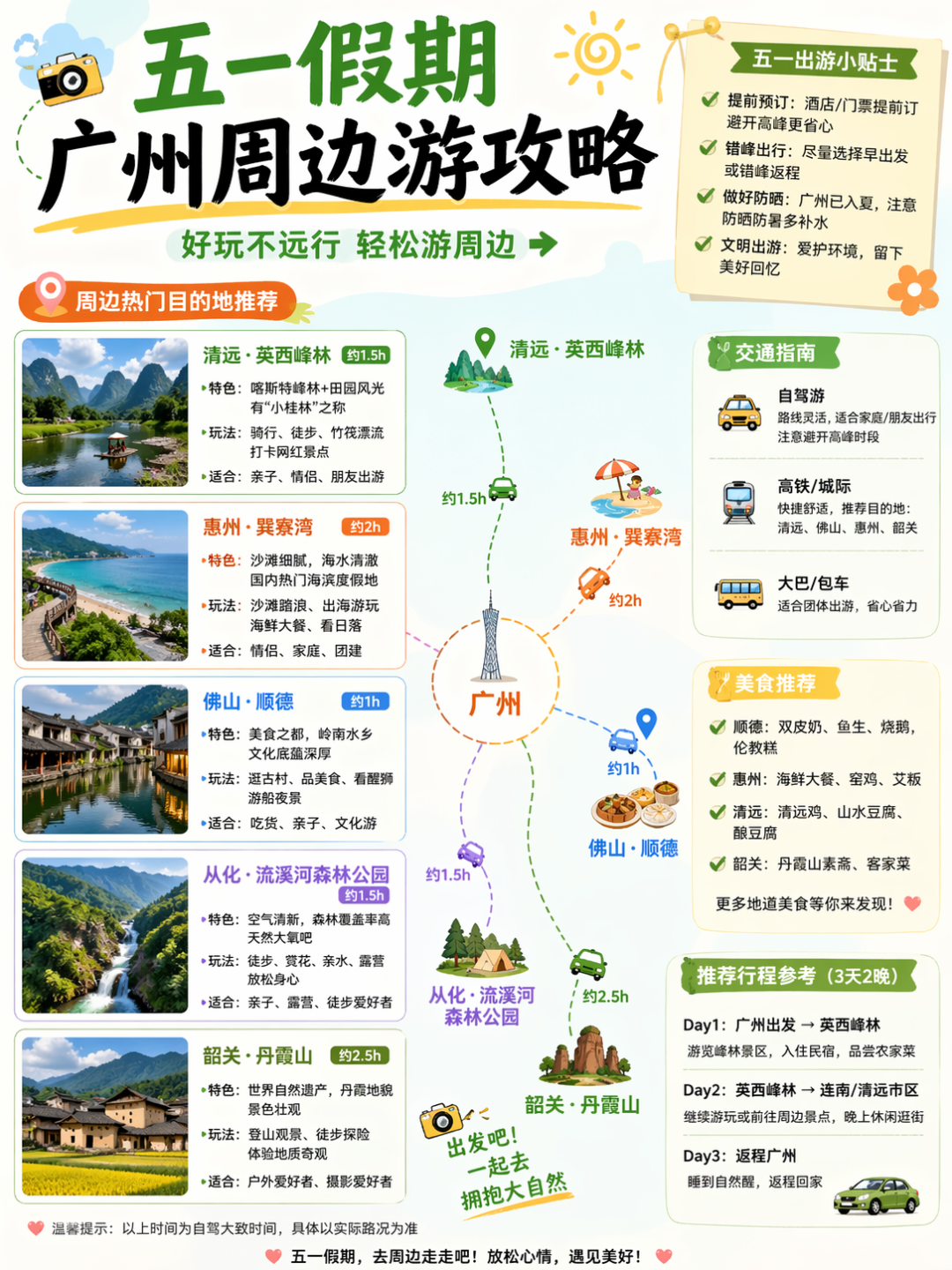 提示词:生成一张五一假期广州周边游的攻略图