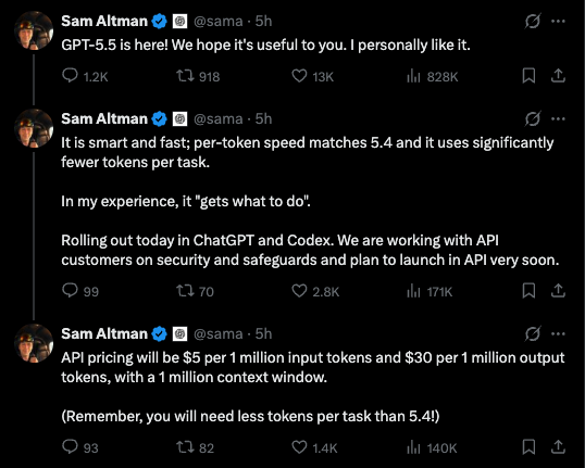 GPT-5.5来了。API定价$5/$30每百万token,GPT-5.4的两倍。