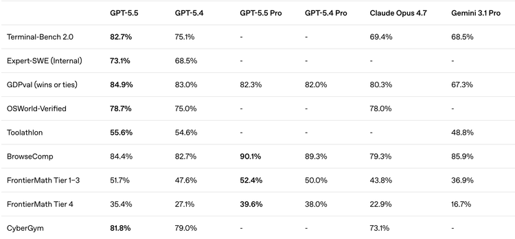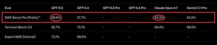 - SWE-Bench Pro(编码):GPT-5.5不及Opus 4.7。@deedydas指出OpenAI刻意没在发布材料里报这个成绩——”trying really hard to bury the lede.”