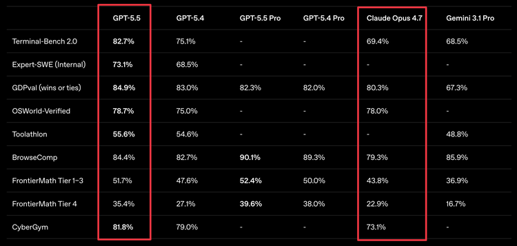 - 幻觉率(AA-Omniscience):GPT-5.5为86%,Opus 4.7为36%。上一代GPT-5.4是89%——两代之间只降了3个百分点。