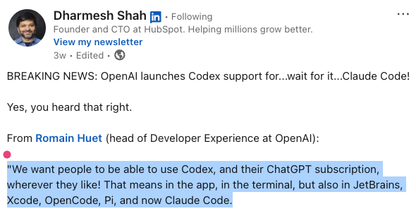 OpenAI开发者体验主管Romain Huet的原话:”We want people to be able to use Codex, and their ChatGPT subscription, wherever they like!”