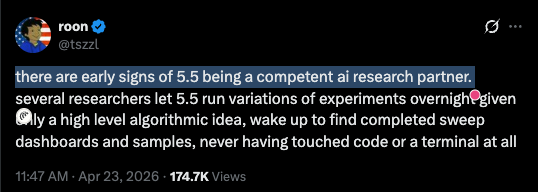 OpenAI员工@tszzl透露已有研究者用GPT-5.5做”隔夜实验”:给个算法idea,通宵跑,醒来dashboard就绪。他的措辞是”competent AI research partner”。不是assistant,是partner。