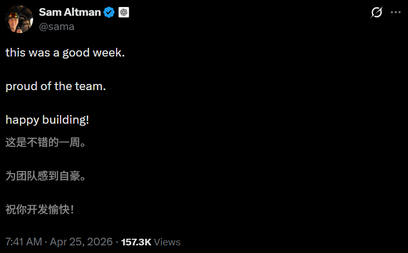 25日早上,心情大好的奥特曼发了条X,「这周过得不错,为团队感到骄傲,祝大家开发愉快!」