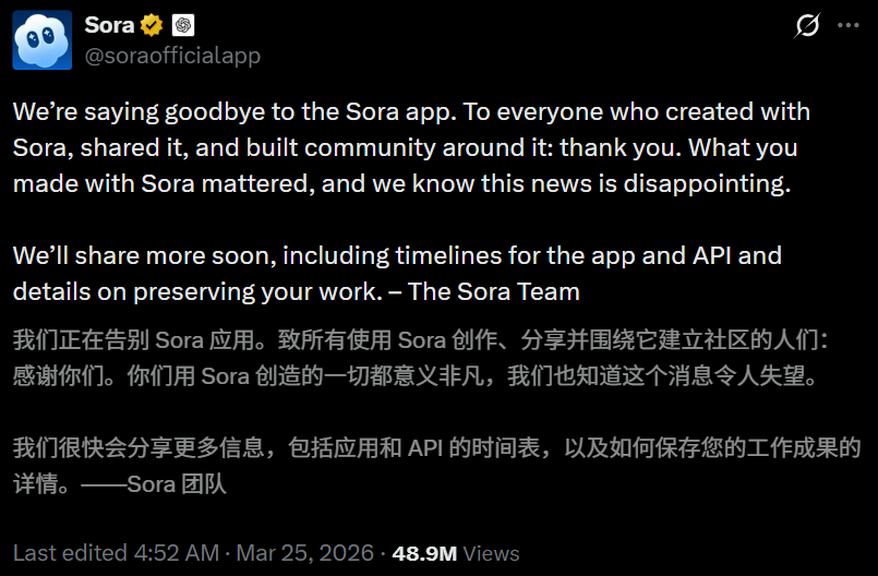 4月26日,也就是明天,Sora正式关停。