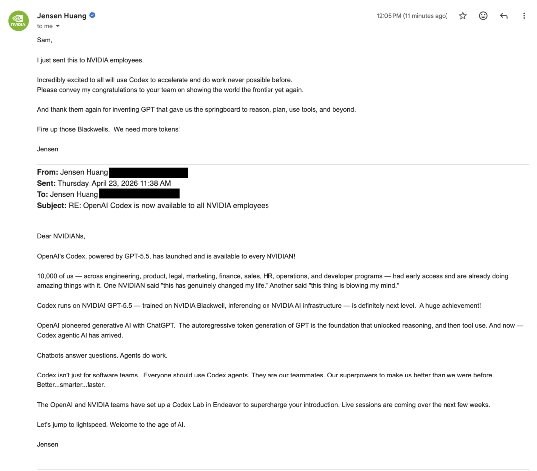老黄给全公司发了内部信,让10000多名员工用上Codex。工程师、法务、市场、财务、HR,全覆盖。